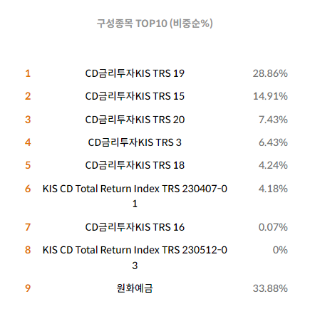 구성종목 면에서는 CD금리 관련 TRS(Total Return Swap) 계약이 대부분을 이루고 있습니다. CD금리투자KIS TRS 19가 28.86%로 가장 높은 비중을 차지하며, 원화예금도 33.88%에 달합니다. TRS 계약을 통해 유동성 위험을 낮추고 CD금리에 대한 익스포저를 높이는 전략으로 보입니다.