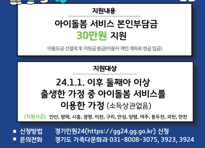 | 지원 대상 | 2024년 1월 1일 이후 둘째아 이상 출산 가정 중 출산일로부터 1년 이내 아이돌봄 서비스 이용 가정 (경기도 내 12개 시군 거주) |