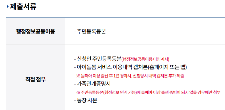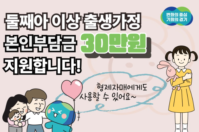 | 지원 내용 | 아이돌봄 서비스 본인부담금 최대 30만 원 (둘째아 이상 출생일로부터 12개월 이내) |