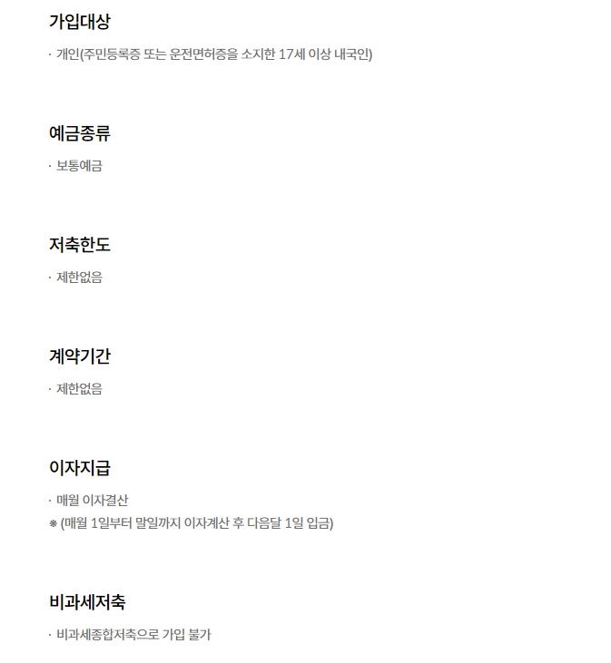 | 이자지급시기 | 매월 이자결산 (매월 1일부터 말일까지 이자계산 후 다음달 1일 입금) |