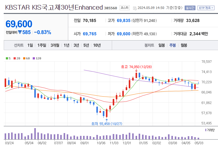 이 ETF는 국내 장기 국채에 투자하는 채권형 상품으로, KIS 국고채30년Enhanced 지수의 성과를 추종합니다. 운용 규모는 4,447억원, 상장좌수는 6,380,000주에 달합니다. 지난 1년간 주가는 최고 75,690원, 최저 56,685원을 오갔습니다. 2021년 5월 26일 상장되었으며, 운용보수는 연 0.05% 수준으로 저렴한 편입니다. 운용은 KB자산운용에서 전담하고 있습니다.