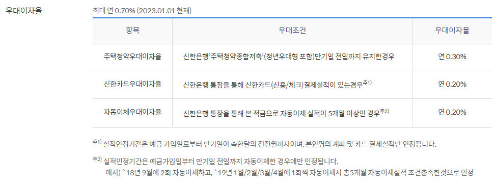 | 우대금리 | 최대 0.70% (주택청약종합저축 유지, 신한카드 결제, 자동이체 등) |