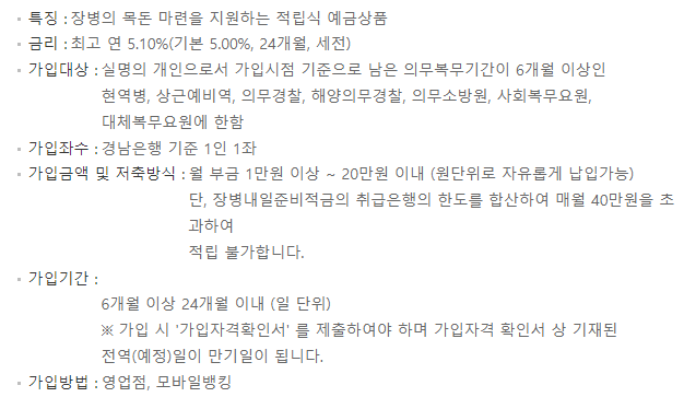 경남은행 장병내일준비적금의 주요 내용은 다음과 같습니다.