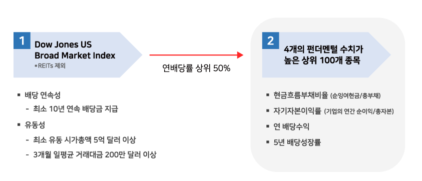 구체적으로는 시가총액, 유동성 등의 기준을 충족하는 기업 중 배당수익률 상위 50% 내에 든 종목 가운데, 순이익 대비 배당금 비율(배당성향)과 주당 순이익 성장률 등을 평가해 최종 편입 종목을 선정하게 됩니다.