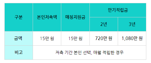| 구분 | 본인저축액 | 매칭지원금 | 만기적립금 |