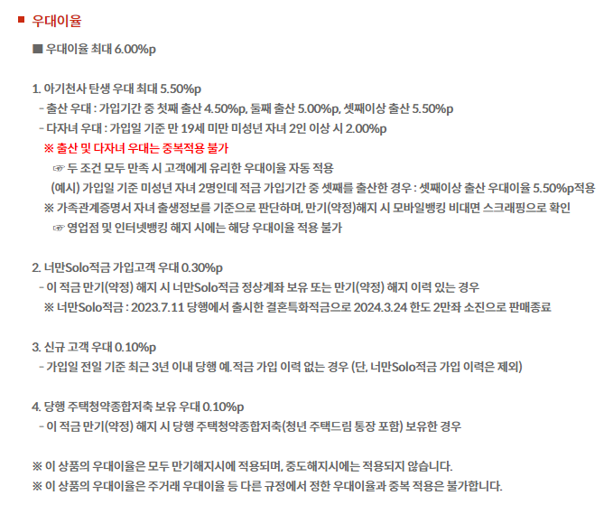 | 우대금리 | 최고 연 6.00%p (자녀 출산 외 다수) |