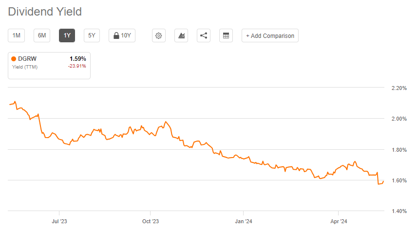 | 1년 수익률(Total return) | DGRW +21.03% / S&P500 +27.16% |