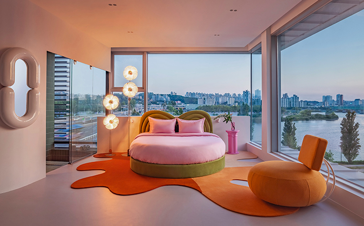 '스카이 스위트'의 으뜸 장점은 아름다운 한강 전망을 감상할 수 있다는 점입니다. 객실에 마련된 큼지막한 통유리창 너머로 노들섬에서 여의도까지 이어지는 눈부신 풍경이 펼쳐집니다.