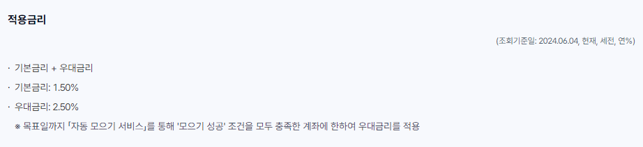 | 금리 안내 | - 기본금리 1.50% (2024.06.04 기준, 세전, 연) - 우대금리 2.50% (자동 모으기 서비스 모으기 성공 조건 충족 시 적용) - 최초 예금일부터 목표일 전일까지 일별 최종 잔액에 약정 금리 적용하여 이자 계산 - 목표일에 이자 지급 |