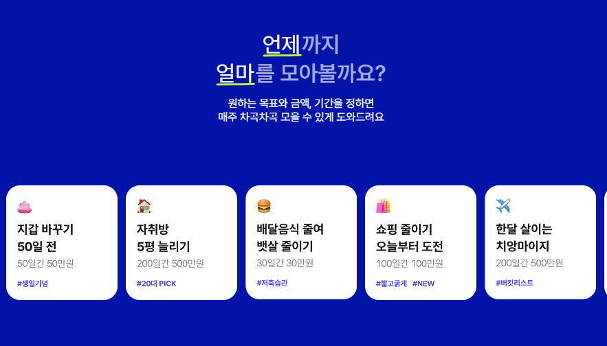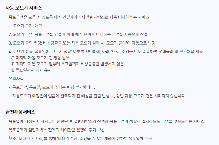 | 서비스 안내 | - 지정된 연결계좌를 통한 거래만 가능 - 자동 모으기 서비스를 통해 매주 자동 이체 입금 (직접 이체 불가) - 비상금출금 서비스로 횟수 제한 없이 출금 가능 - 중도 해지 시 해지 시점 원금 및 약정 기본금리 적용하여 연결계좌로 전액 입금 - 만기 해지 시 목표일에 자동 해지, 원금과 약정이자, 끝전채움 금액 포함 전액 입금 (재예치 불가) |