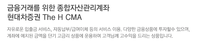 현대차증권 The H CMA는 RP, MMF, MMW 같은 단기 고수익 상품에 자동으로 매수되어 높은 수준의 수익률을 안정적으로 제공하는 상품입니다. 동시에 국내외 펀드와 적립식 펀드 등 다양한 금융상품 투자가 가능하고, 카드결제와 자동이체 서비스도 이용할 수 있는 종합자산관리계좌의 성격을 가지고 있습니다.