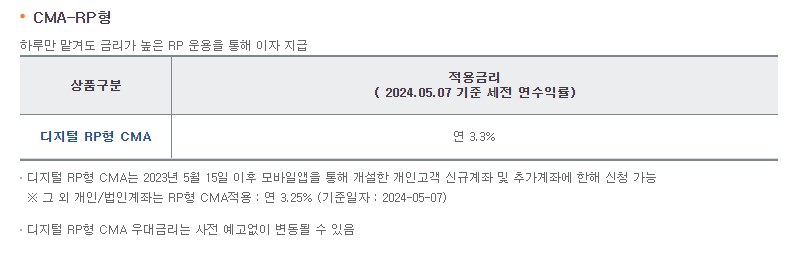 - 수익률: 디지털 RP형 CMA 연 3.3%, RP형 CMA 연 3.25% (2024.05.07 기준)