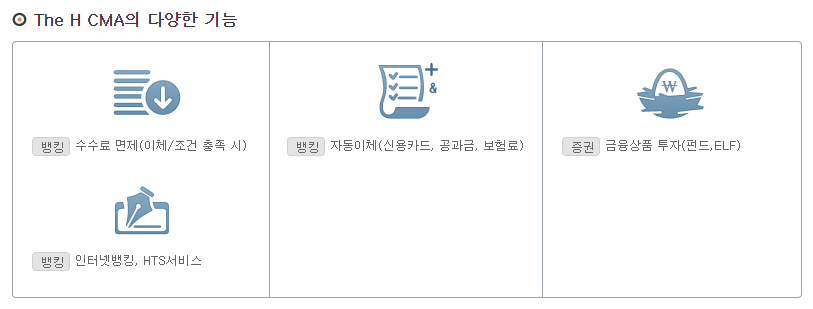 The H CMA는 RP, MMF, MMW 등에 자동으로 투자되어 안정적인 고수익을 추구하는 한편, 펀드투자, 카드결제, 자동이체 등 종합자산관리계좌의 다양한 기능을 제공하는 상품입니다. 특히 모바일앱을 통해 가입하는 고객에게는 추가 금리 우대 혜택까지 적용되어 더욱 매력적입니다.